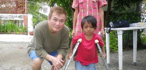 内山アジア教育基金では身障者の奨学生を何人もかかえています。 その1人、10数年前には歩くどころか立ち上がるのも容易ではなかった先天性骨格形成不全の少年、万年ビリケツが定位置でした。 ハッパをかけ続けるウチヤマとスポンサーさん。が、なんの変化も…